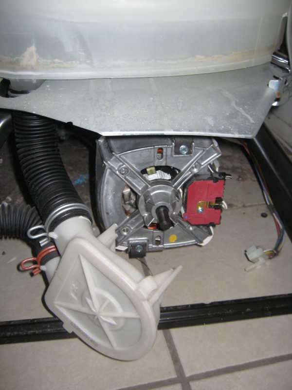 Next, you need to get access to the motor coupling, which is a little plastic part that connects the motor to the transmission. The transmission is what drives the spinning of the drum and the agitation. To get at the coupling, you need to remove the pump, which is attached the front of the motor with some clips. This is really easy to remove. Here’s the pump removed, with the motor exposed (the pump is the white thing with hoses attached):