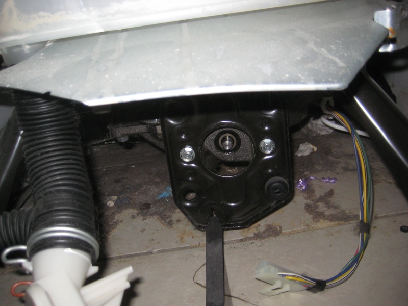 Next, you unplug the wiring harness from the motor (there was only one on this model, contrary to the instructions). You remove some screws from the motor, pop off some clips, and it pops right out. When you remove the motor, you want to be careful because it’s pretty heavy. I put a bunched up towel under it, so it wouldn’t bang up the floor, but getting the clips off required some screwdriver prying, so I remove the towel for better access, and then ended up dropping it on the floor. Oops. With the motor removed, you end up with something looking like this.
