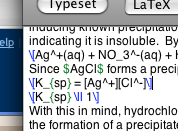 One of the more annoying aspects of what you can do with Sakai (and Microsoft’s Equation Editor I might add) is that you have to do tons of highlighting and clicking to format things. Like, if I want a chemical equation like HC2H3O2, it requires highlighting 3 things and clicking 3 buttons. That back and forth of the mouse gets quite frustrating. In LaTeX, things are much simpler. You would just write: